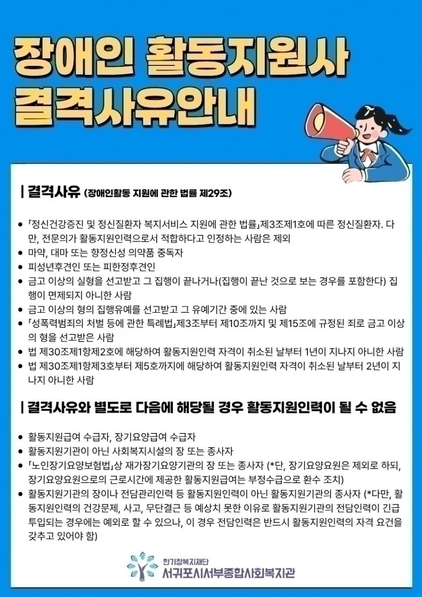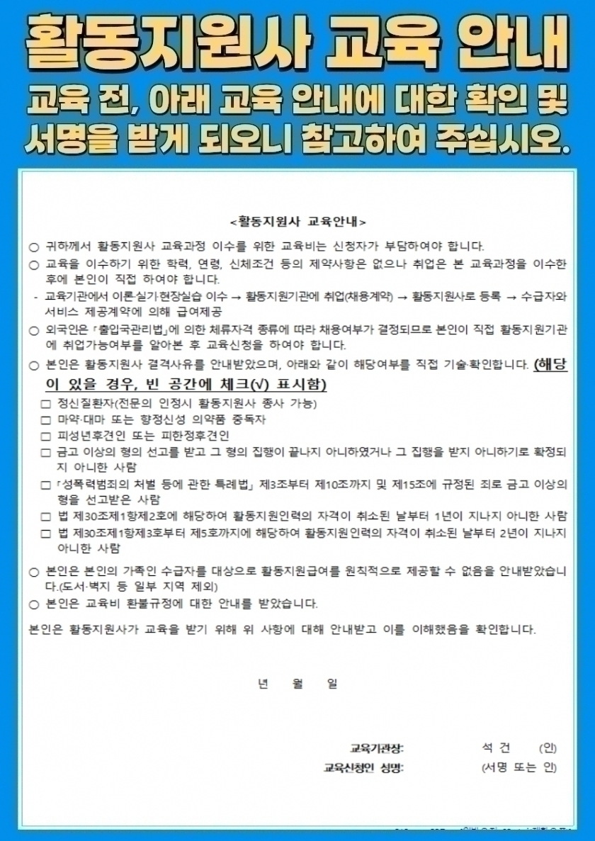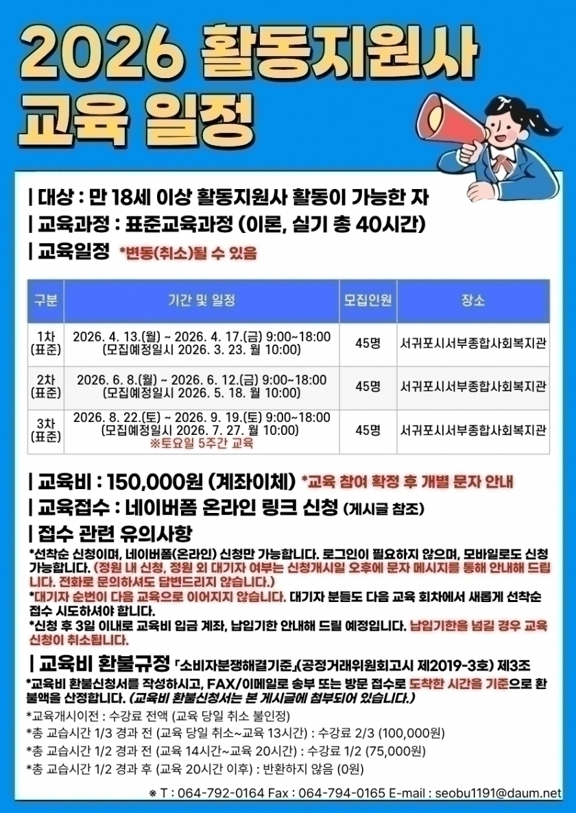 ![]() ![]() ![]() *교육기관은 실습 및 취업 알선을 하지 않습니다. *장애인 활동지원사 교육 일정 (변동될 수 있음) 1차 : 2026. 4. 13. ~ 4. 17. (월~금 9:00 ~ 18:00) - 모집개시일 : 2026. 3. 23. 10:00 2차 : 2026. 6. 8. ~ 6. 12. (월~금 9:00 ~ 18:00) - 모집개시일 : 2026. 5. 18. 10:00 3차 : 2026. 8. 22.(토) ~ 2026. 9. 19.(토) (9:00 ~ 18:00) - 모집개시일 : 2026. 7. 27. 10:00 - 토요 교육 일정 1일차 : 8월 22일 (토) 2일차 : 8월 29일 (토) 3일차 : 9월 5일 (토) 4일차 : 9월 12일 (토) 5일차 : 9월 19일 (토) ※ 교육 참여 시 중식은 도시락을 지참하거나, 외부에서 개인적으로 식사하셔야 합니다. *접수 방법 : 온라인 접수(선착순) ※ 추후 접수일 도래 시 링크 게시 *교육비 표준교육 150,000원 (교육 참여자 확정 후 개별 문자 안내) *유의사항 - 온라인 신청 시 작성한 내용은 수정이 불가하오니 정확하게 기입하여 주십시오. 잘못 작성된 내용으로 인한 교육 취소의 책임은 전적으로 교육신청자에게 있음을 알려드립니다. - 상기 게시한 결격사유를 반드시 확인하시고 교육 신청해 주십시오. - 교육비 입금 후 환불은 '환불신청서'를 작성하여 팩스, 이메일, 방문접수를 통해 제출하여 주십시오. (신청서 도착일을 기준일로 환불액을 산정합니다.) ※ 환불 규정 교육개시이전 : 수강료 전액 (교육 당일 취소는 불인정) 총 교습시간의 1/3 경과 전 (13시간) : 수강료의 2/3 해당액 (100,000원) 총 교습시간의 1/2 경과 전 (20시간) : 수강료의 1/2 해당액 (75,000원) 총 교습시간의 1/2 경과 이후 (20시간 이후) : 반환하지 않음 (0원) |