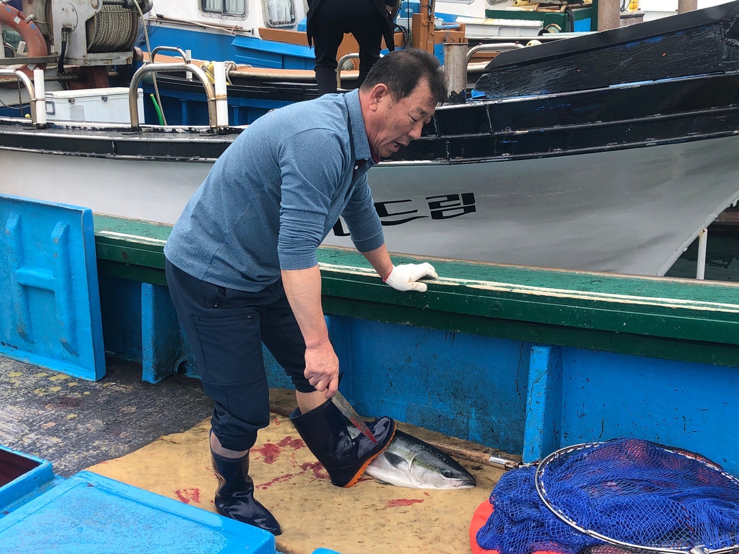 겨울철이 지나가고 있는데 부시리 방어가 여전히 살이 통통하게 올라 어선의 어창 안을 힘차게 헤엄치고 있습니다. 선장님께서 부시리 방어 피 빼서 넘겨주신 것을 넘겨받아 고윤덕회장님께서 아시는 생선가게로 가지고 가서 손질부탁했습니다.