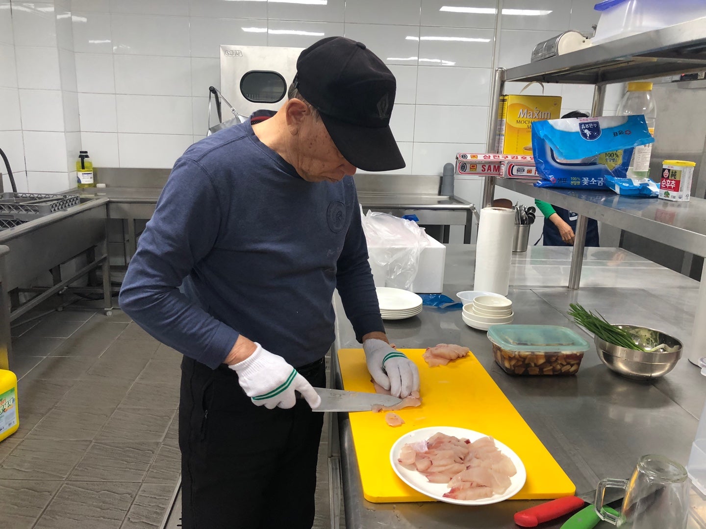 식당으로 가져온 두툼한 생선살을 먹기 좋게 썰어서 접시에 담으십니다.