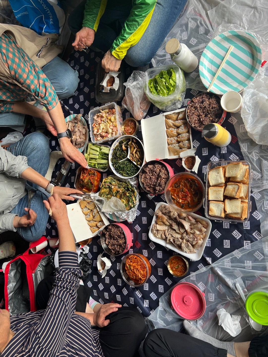 그곳에 자리를 잡고 식사준비를 합니다. 각자 가지고 온 반찬을 꺼냅니다.