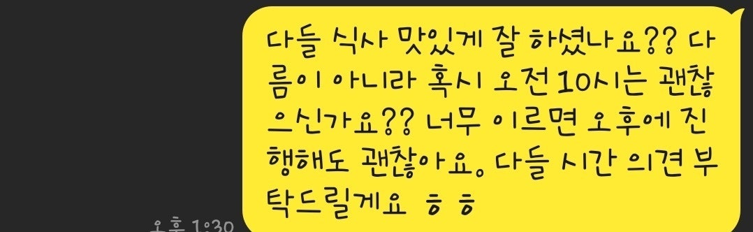 회원분들은 다들 좋다고 하셨습니다. 몇몇 회원분들께서는 일정이 빠듯해 못오실수도 있다고 하셨으나, 그래도 한달에 몇번 되지 않는 정기모임이라 다들 일정을 변경하고 당일에 같이 참석하는 걸로 하였습니다.