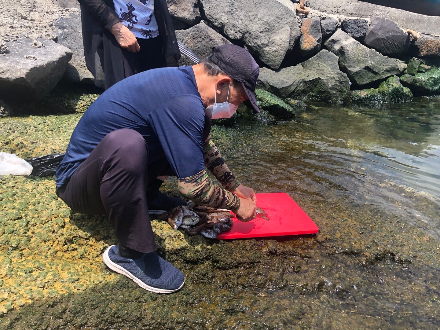 취미로 낚시하는 어르신도 계셔서 낚시에 대해 이것저것 물어봤습니다. 미끼를 어떤걸 쓰면 좋은지 낮보다 밤에 물고기가 더 잘 잡히는 지, 낚시하는 모습도 유심히 살펴보았습니다.