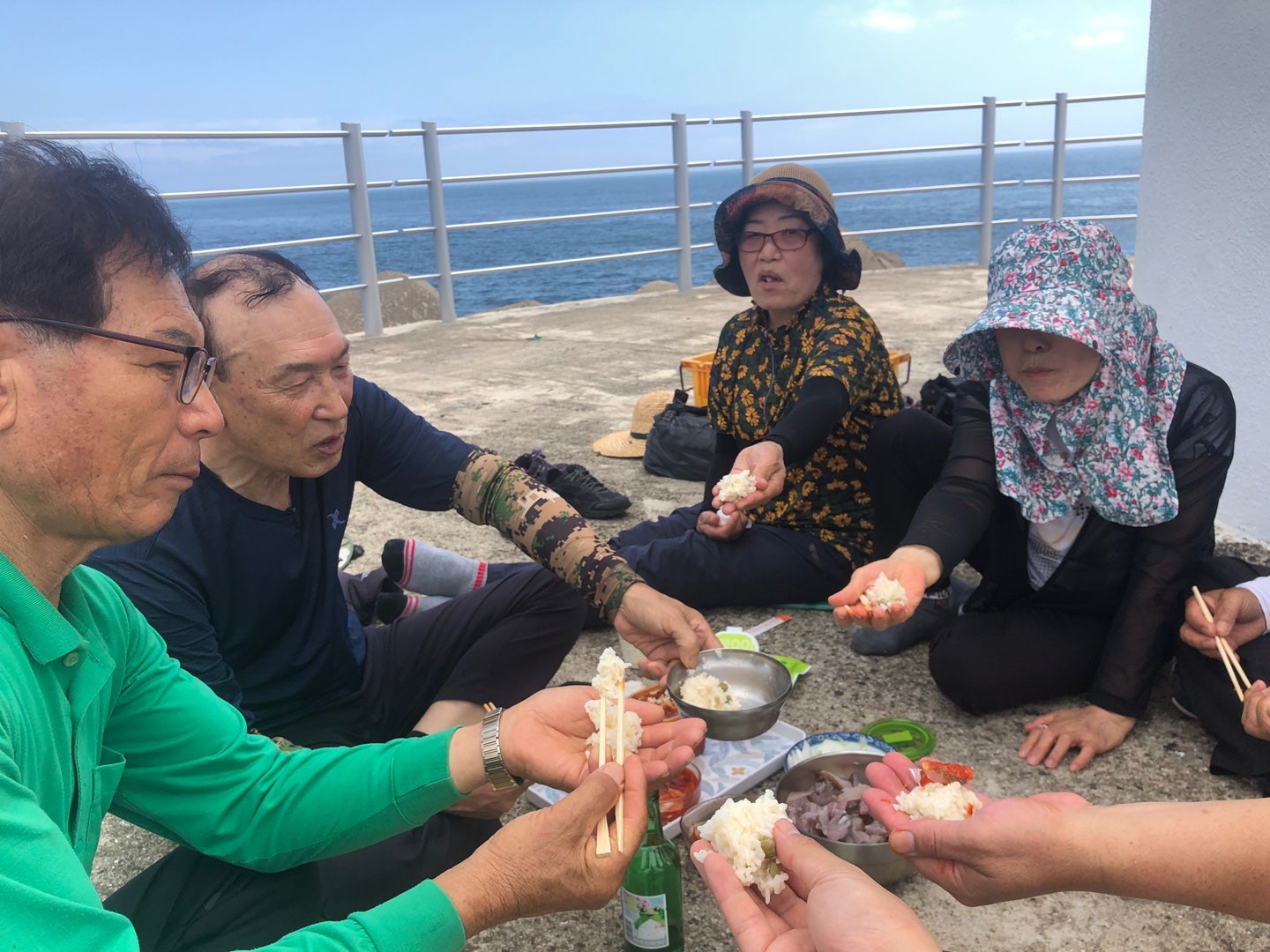 선선하게 바람이 부는 곳에서 떠다니는 배와 멀리 가파도가 보이는 멋진 풍광입니다. 그릇이 없어서 밥을 손바닥에 놓고 먹어도 젓가락이 부족해 손으로 먹어도 달고 맛있었습니다. 그 모습이 정다웠습니다.