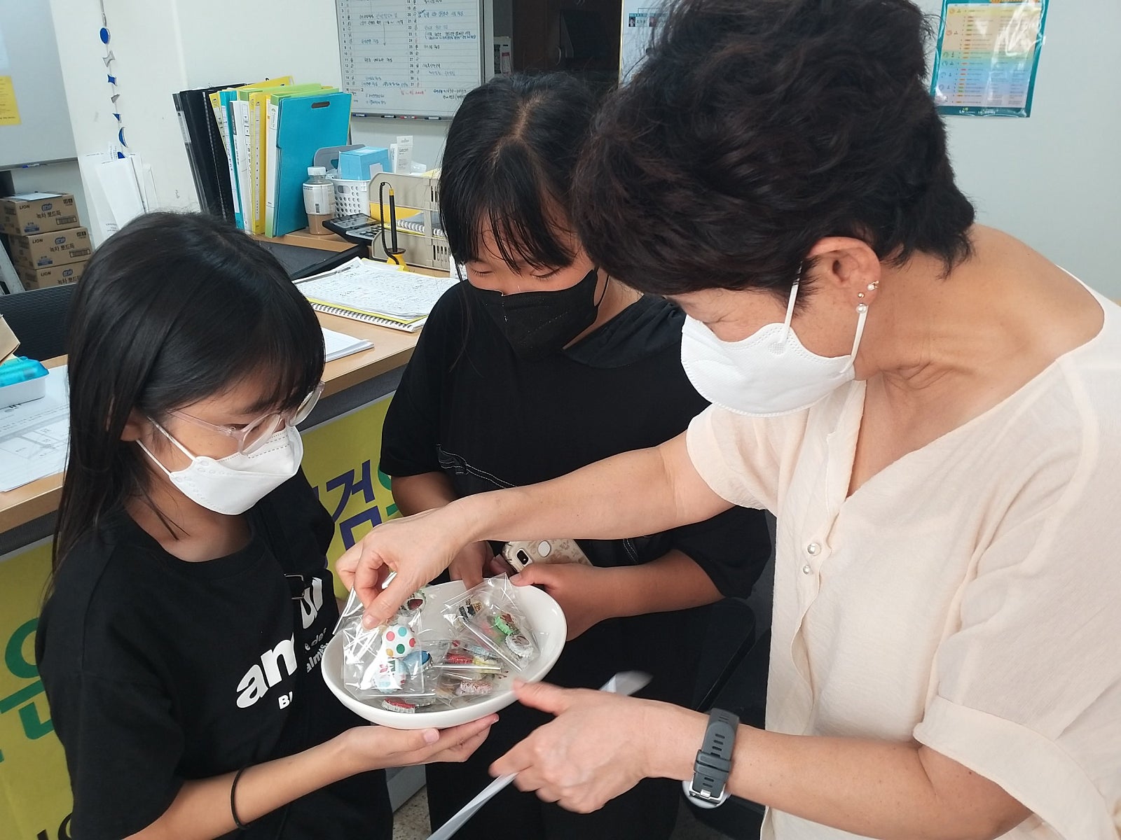 마그넷 나눔을 다 마치고 돌아오는 길 친구들이 '선생님 오늘 기분이 너무 좋아요'