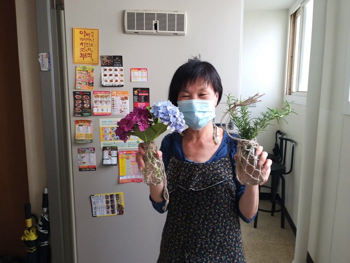 덕순 어르신께 유리병 행잉에 꽂을 로즈마리가 있으며 갖다 주실 수 있는지 부탁 드렸더니 비닐봉지 한가득 로즈마리를 갖다 주셨습니다. 이날 모임에서는 플라스틱과 유리병을 활용하여 저금통과 행잉 두 종류의 제품을 만드는 시간을 가졌습니다.