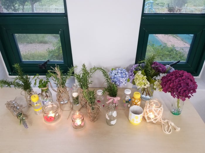 친구들이 직접 그림도 그리고 스티커도 붙어 저금통을 만들고 실과 마끈을 이용해 매듭을 묶어 유리병 행잉도 만들었습니다. 같은 소재와 재료를 이용해 만든 작품인데 만드는 사람의 의도에 따라 조금씩 다른 모습이지만 이런 것이 바로 수제의 묘미가 아닐까 합니다.