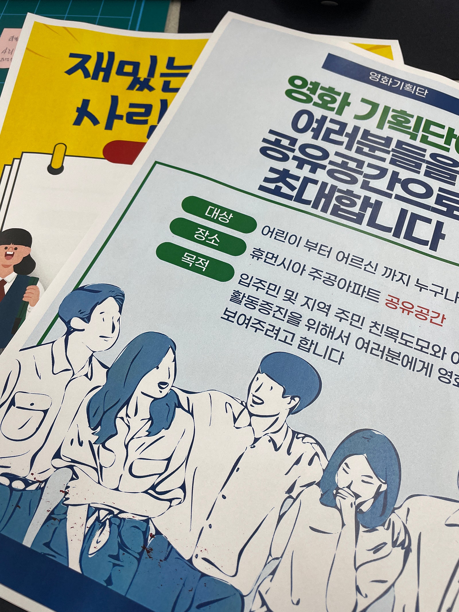 영화제 홍보는? "우선 포스터를 제작하고 휴먼시아 아파트 단지 내 관리사무실에 부탁을 드려서 9단지에 포스터를 부착하면 좋겠고, sns 홍보도 좋을 거 같아요!" 이렇게 기획단 친구들 스스로 적극적인 모습으로 영화기획에 임했습니다.